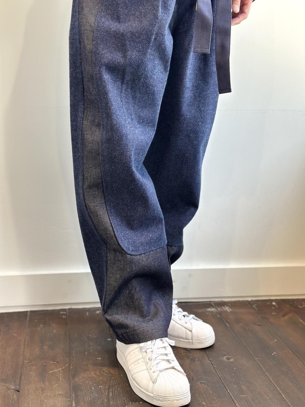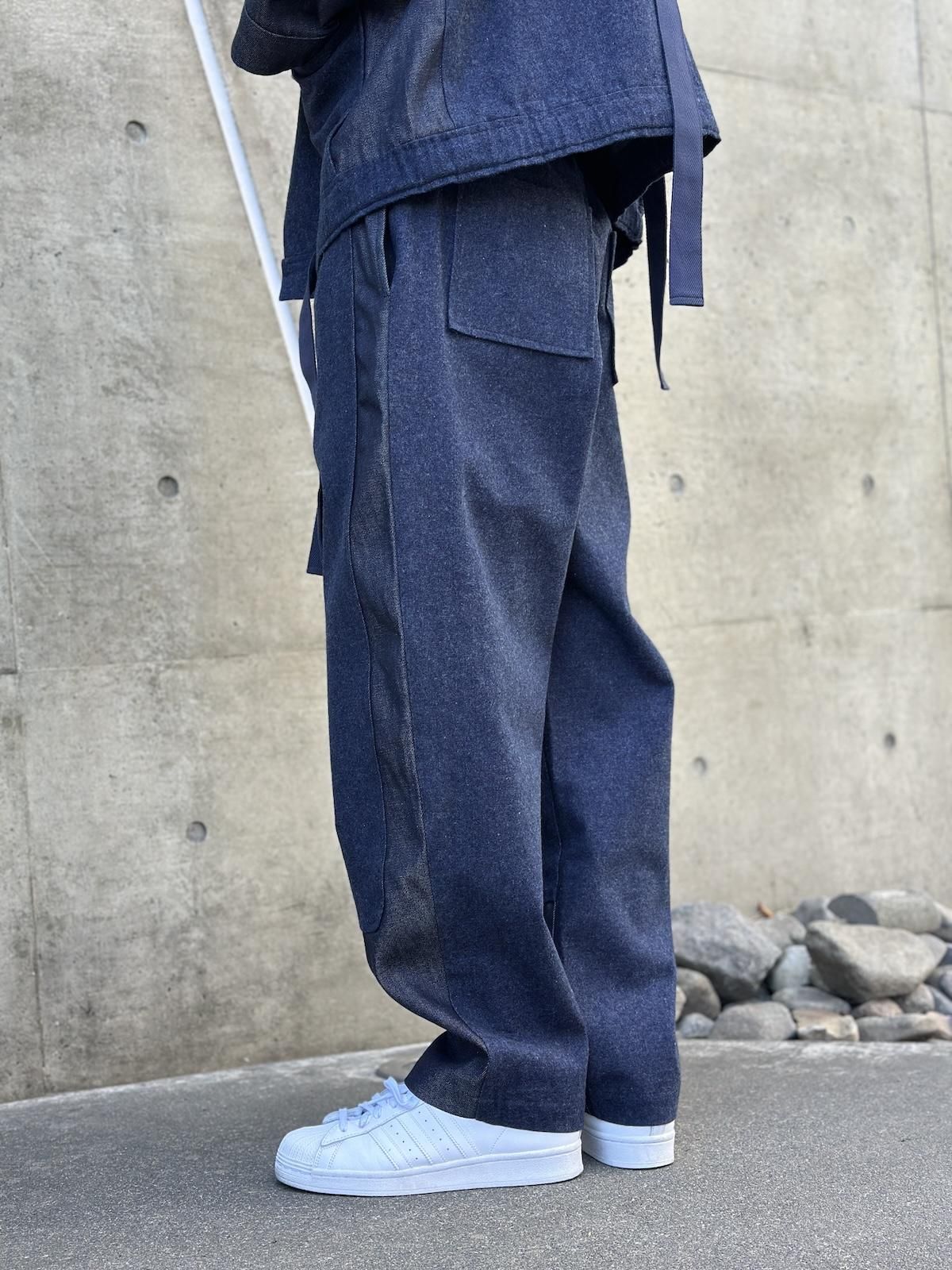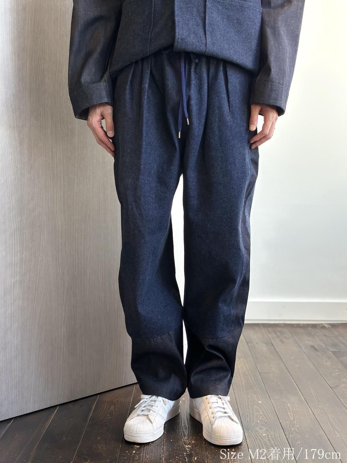 ややテーパードされ、ウエストはゴム&紐のイージーパンツ。