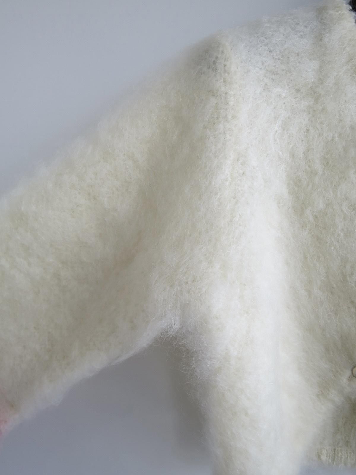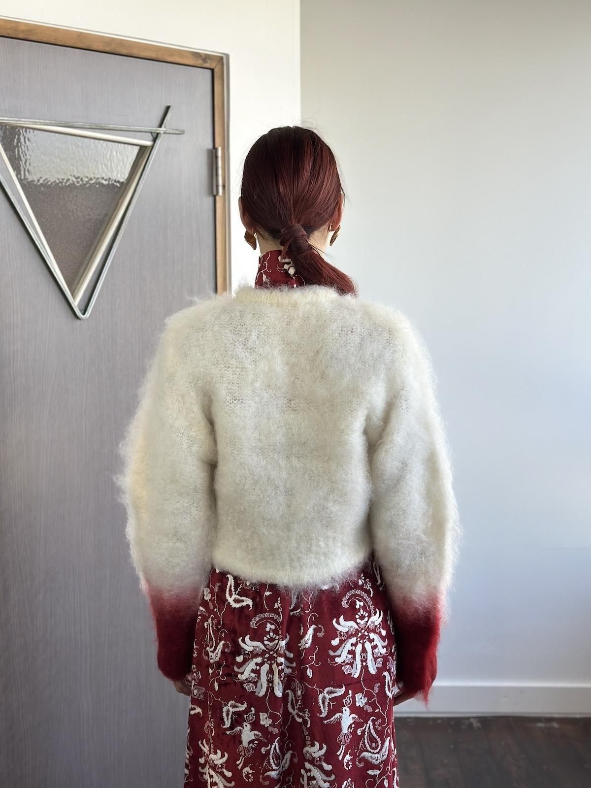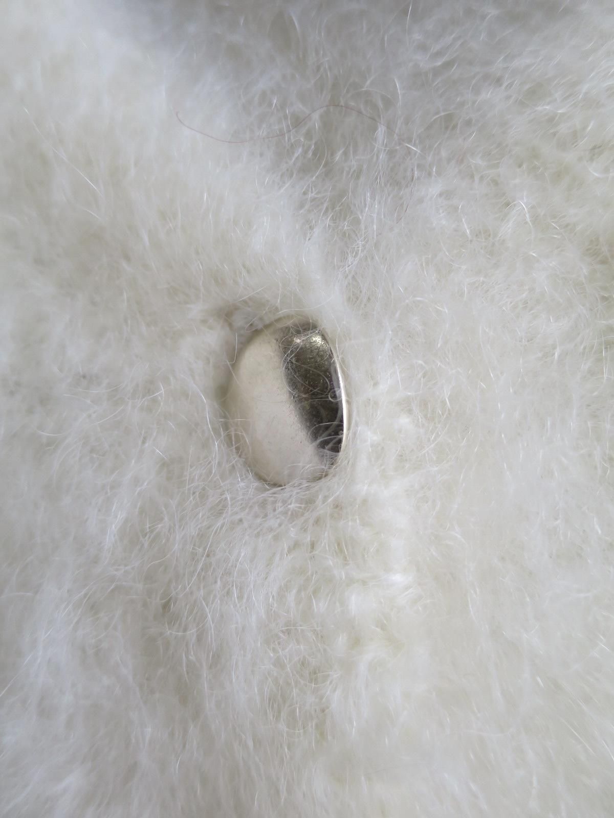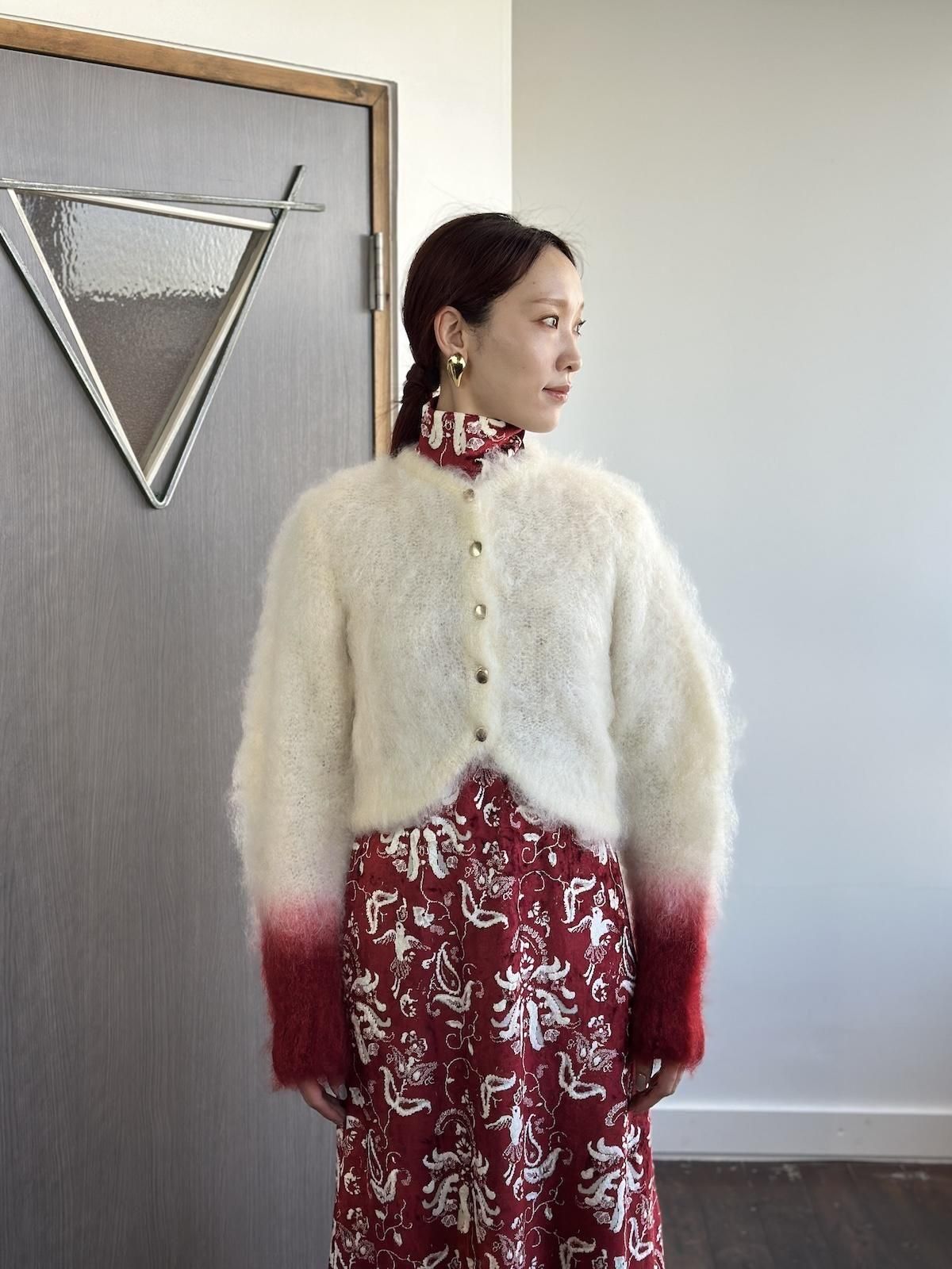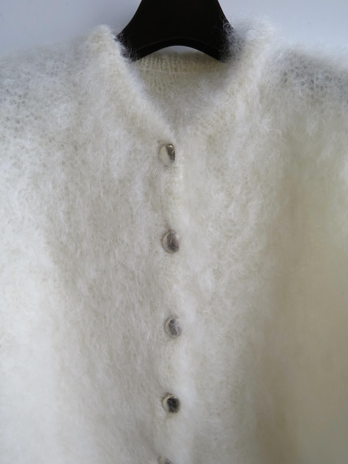 光沢感とハリのあるモヘア糸を使用し、Mame Kurogouchiらしい丸みのある袖のフォルムも特徴的。