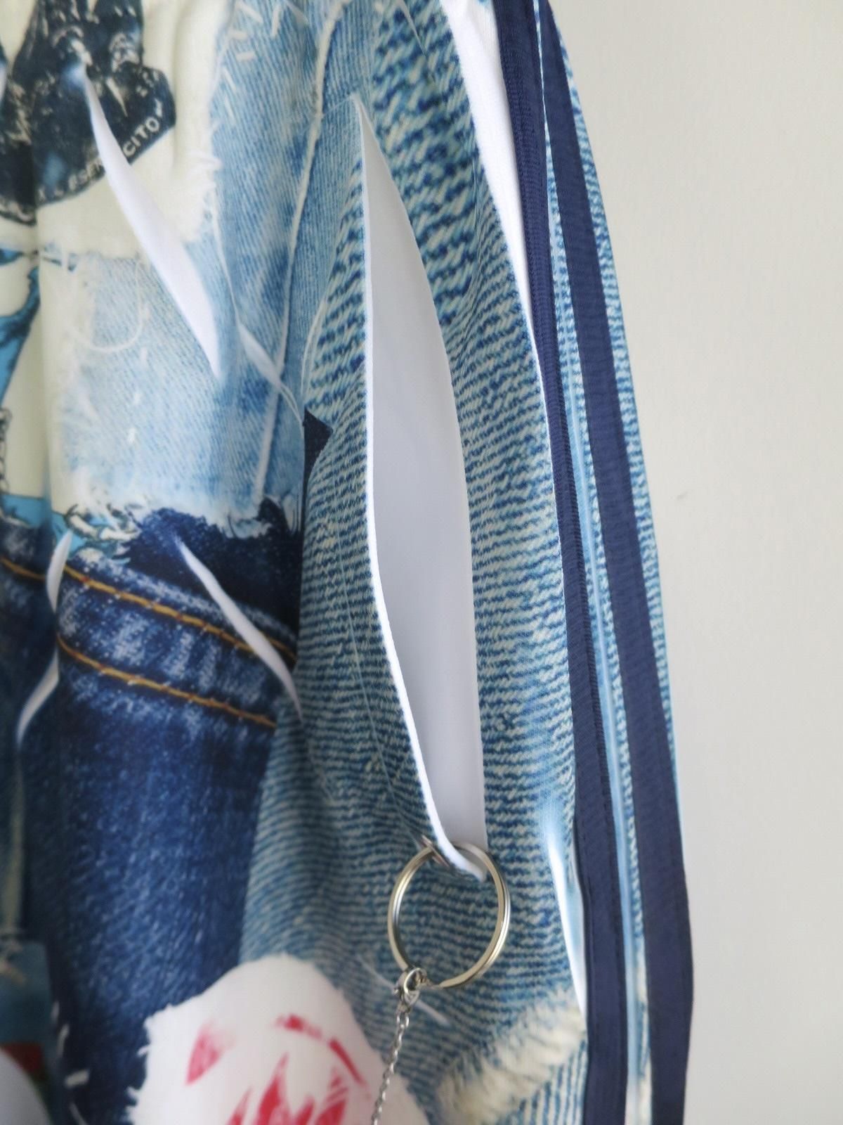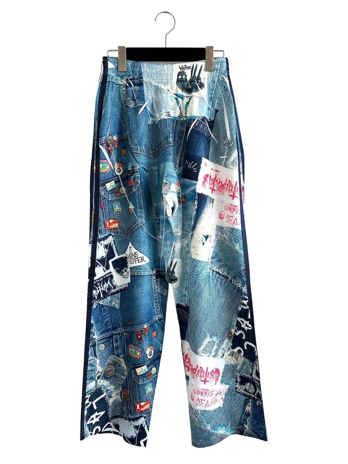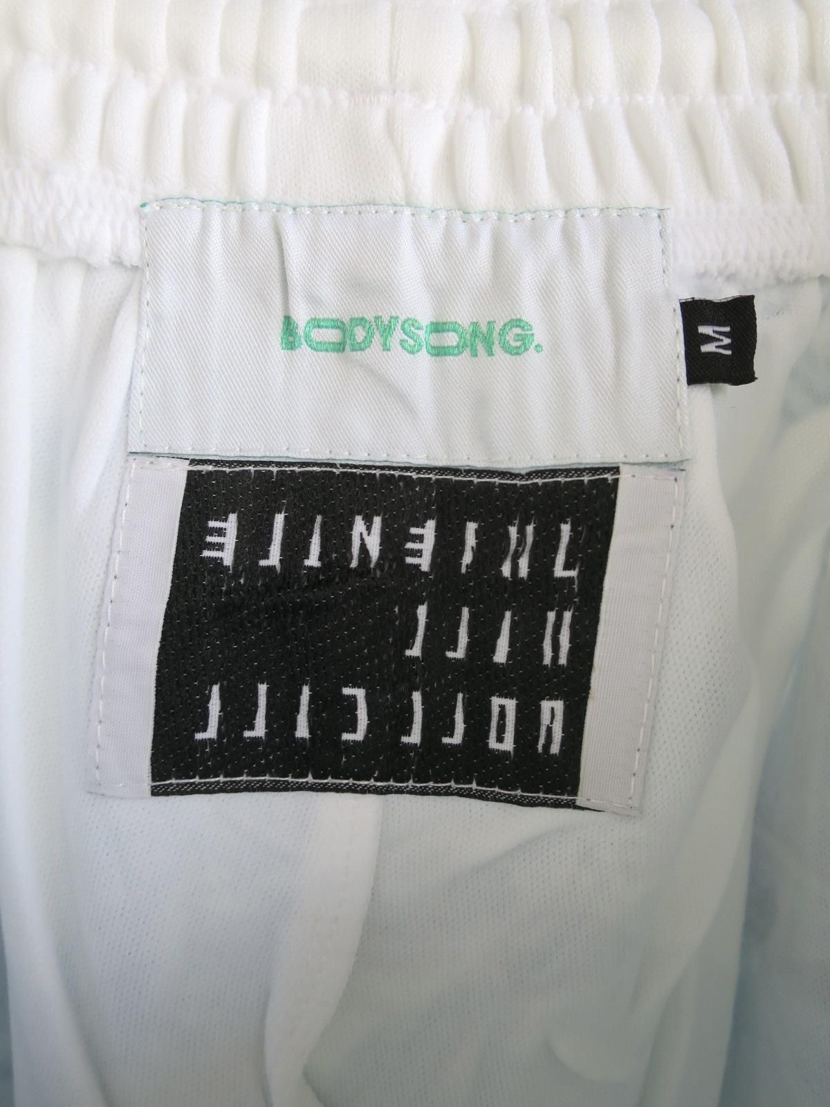 BODYSONG.のライン入りトラックパンツの縫製後にプリントを施しており、1点1点シワやプリントの入り方が異なります。