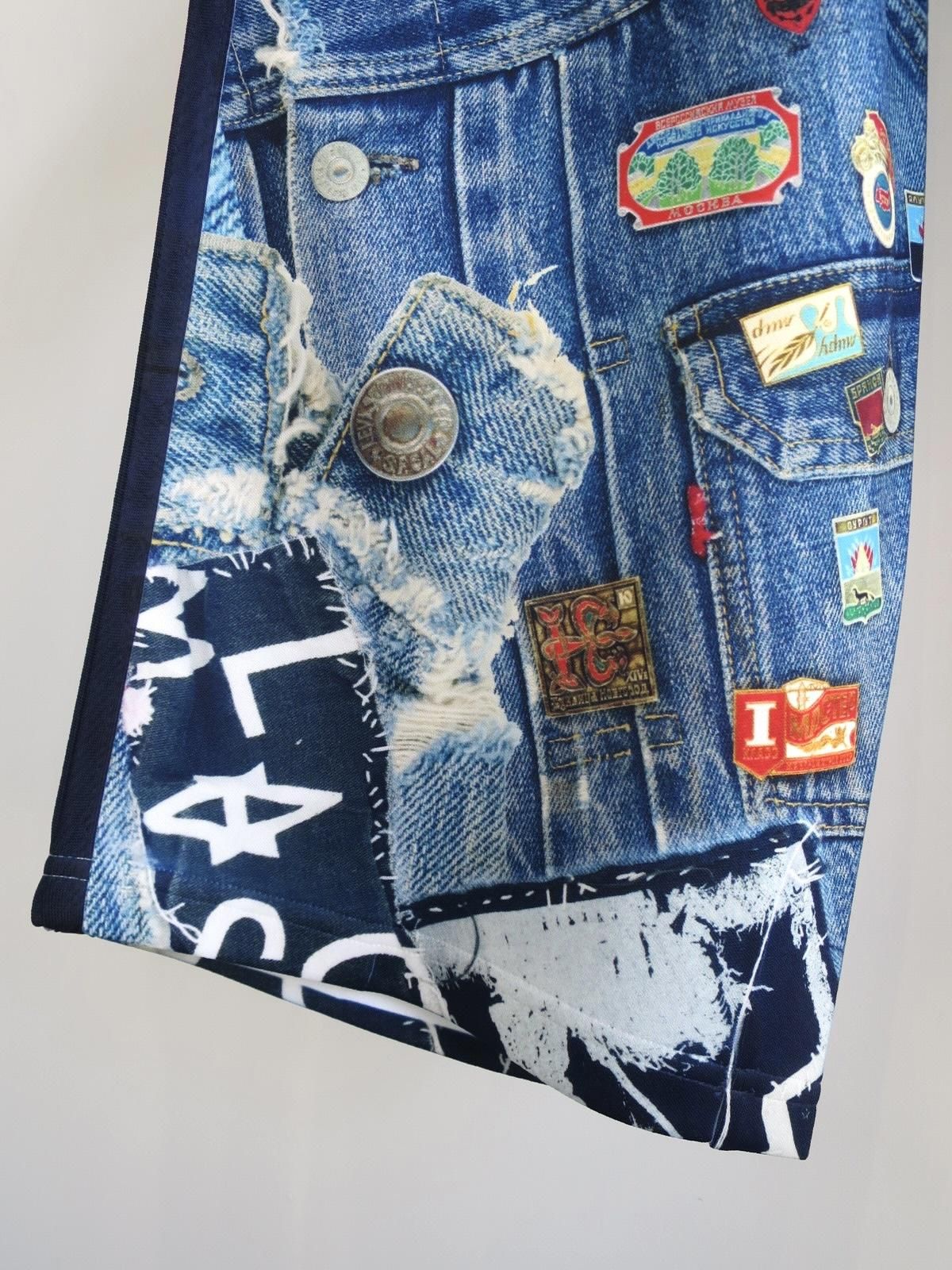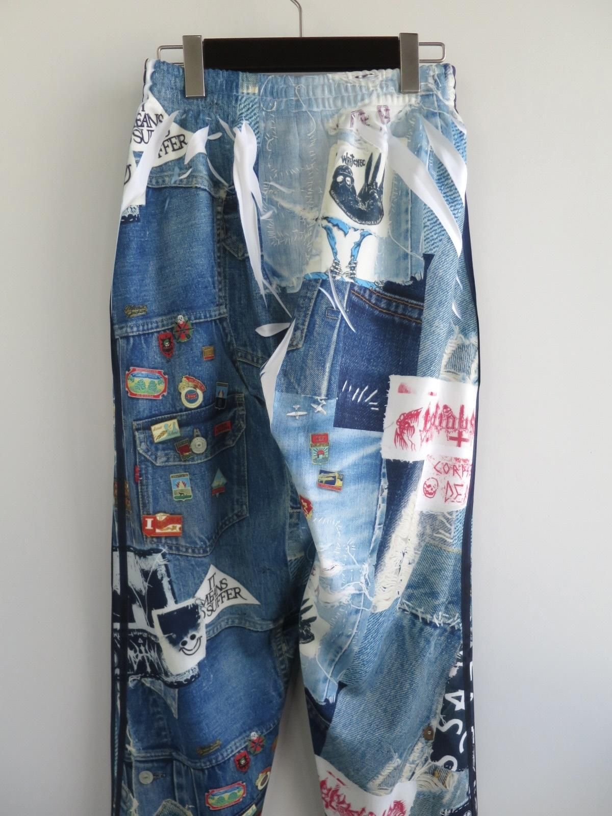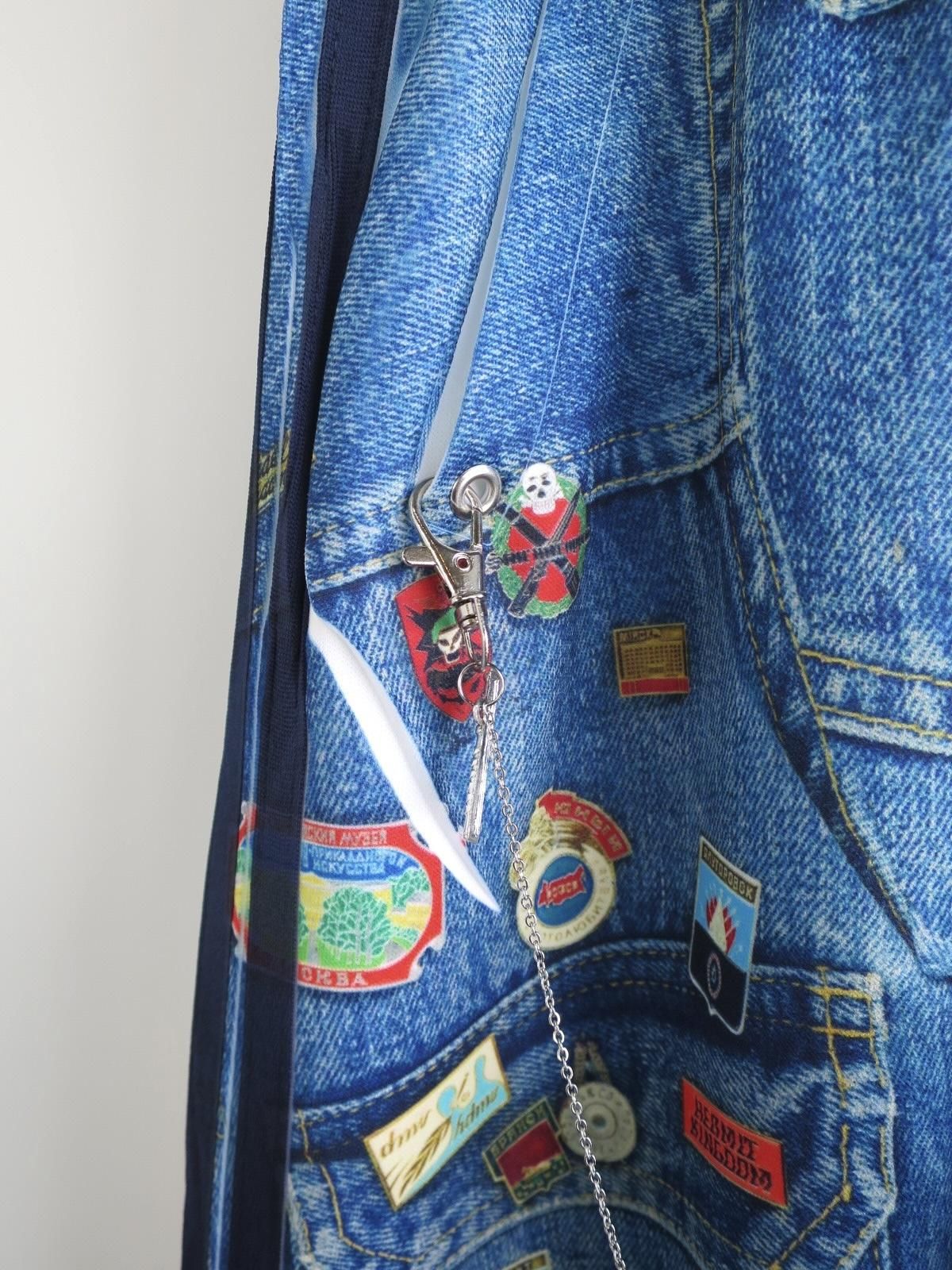 コラボレーションという形で、JUVENILE HALL ROLLCALL(ジュベナイル ホール ロールコール)による、ヴィンテージデニムやワッペン、ピンバッジなどをコラージュしたプリント生地を使用。