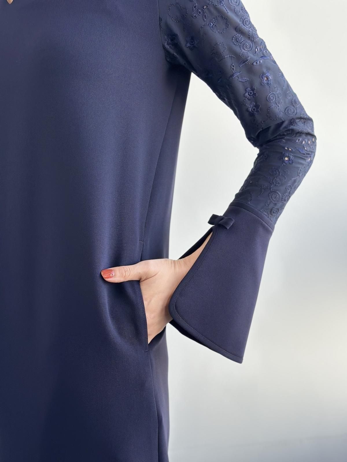 『Mame Kurogouchi』Triacetate Georgette Floral Embroidery Sleeve Classic Dress (ネイビー)