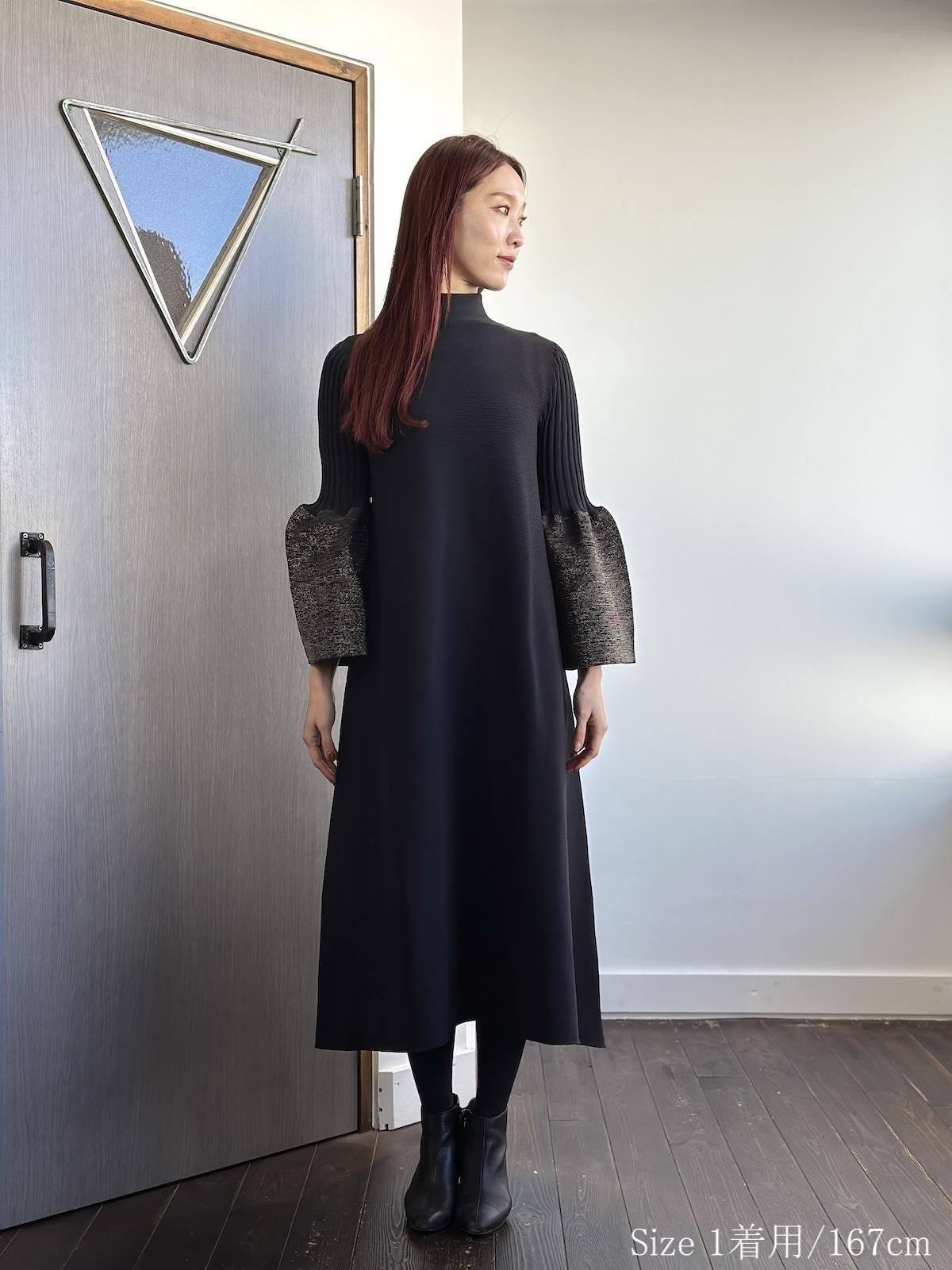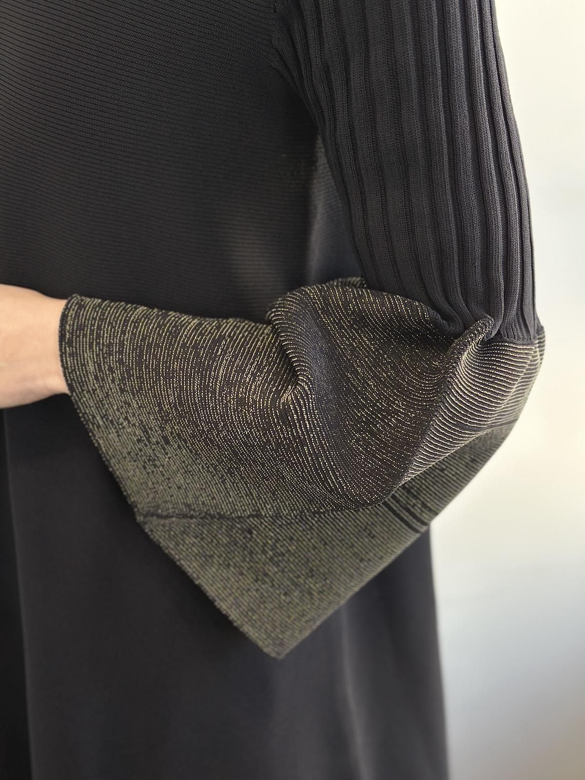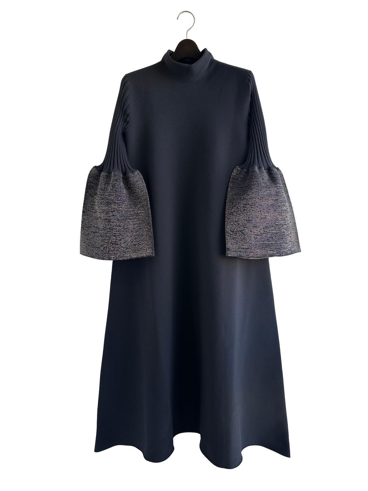 モックネックにコンピュータプログラミングによる立体的なフレアシルエット。